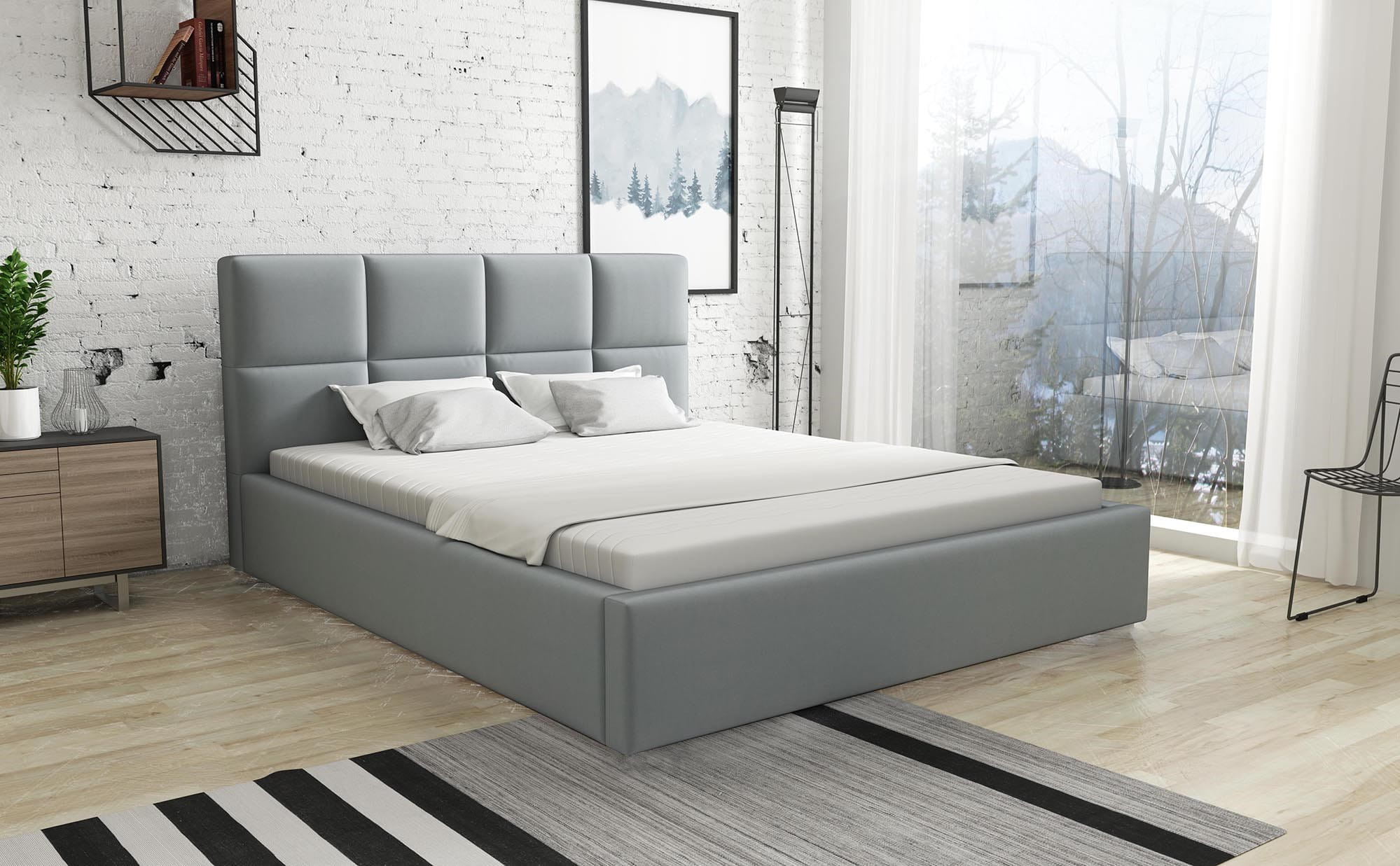 Alaska to łóżko z materacem małżeńskie o bardzo mocnej i wytrzymałej konstrukcji. Posiada pojemnik na pościel oraz mechanizm unoszący materac. Doskonale sprawdzi się w jako łóżko sypialniane. Masywna rama oraz pikowania w kształcie prostokątów podkreślają jego nietuzinkowe walory.