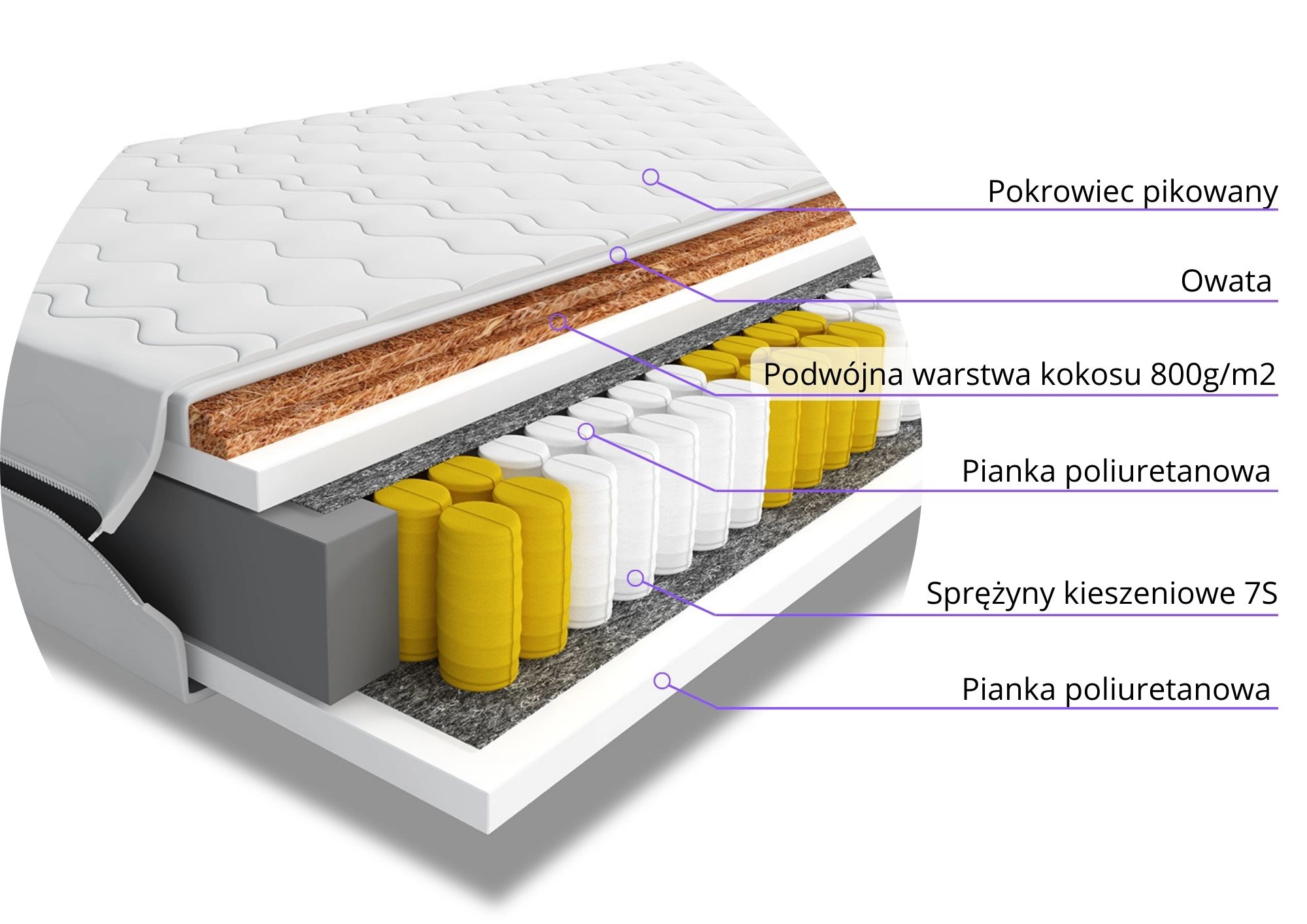 Główna warstwa sprężyn kieszeniowych 7S o wysokości 12 cm oferuje 7 stref twardości, które precyzyjnie podpierają różne części ciała. Każda sprężyna jest podwójnie hartowana, co zapewnia długowieczność i stabilność konstrukcji, minimalizując przenoszenie ruchów partnera i gwarantując spokojny sen.Zalety: