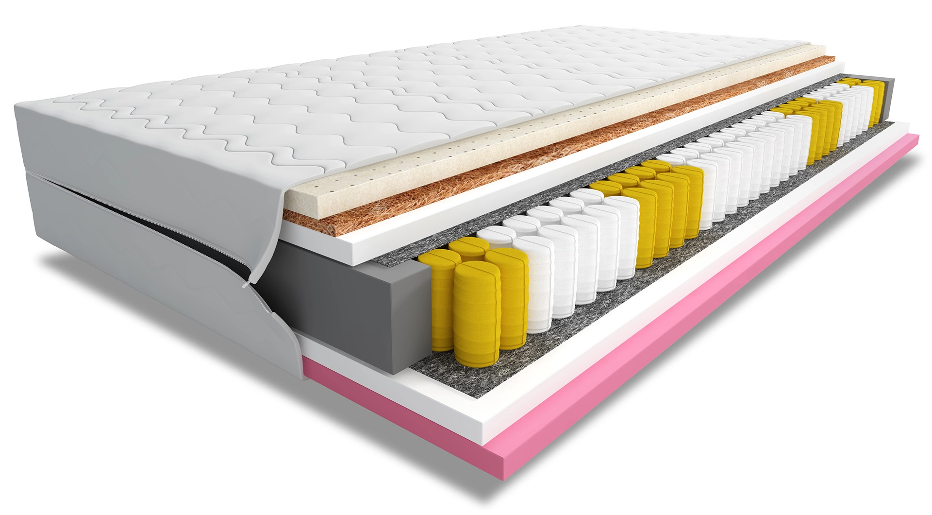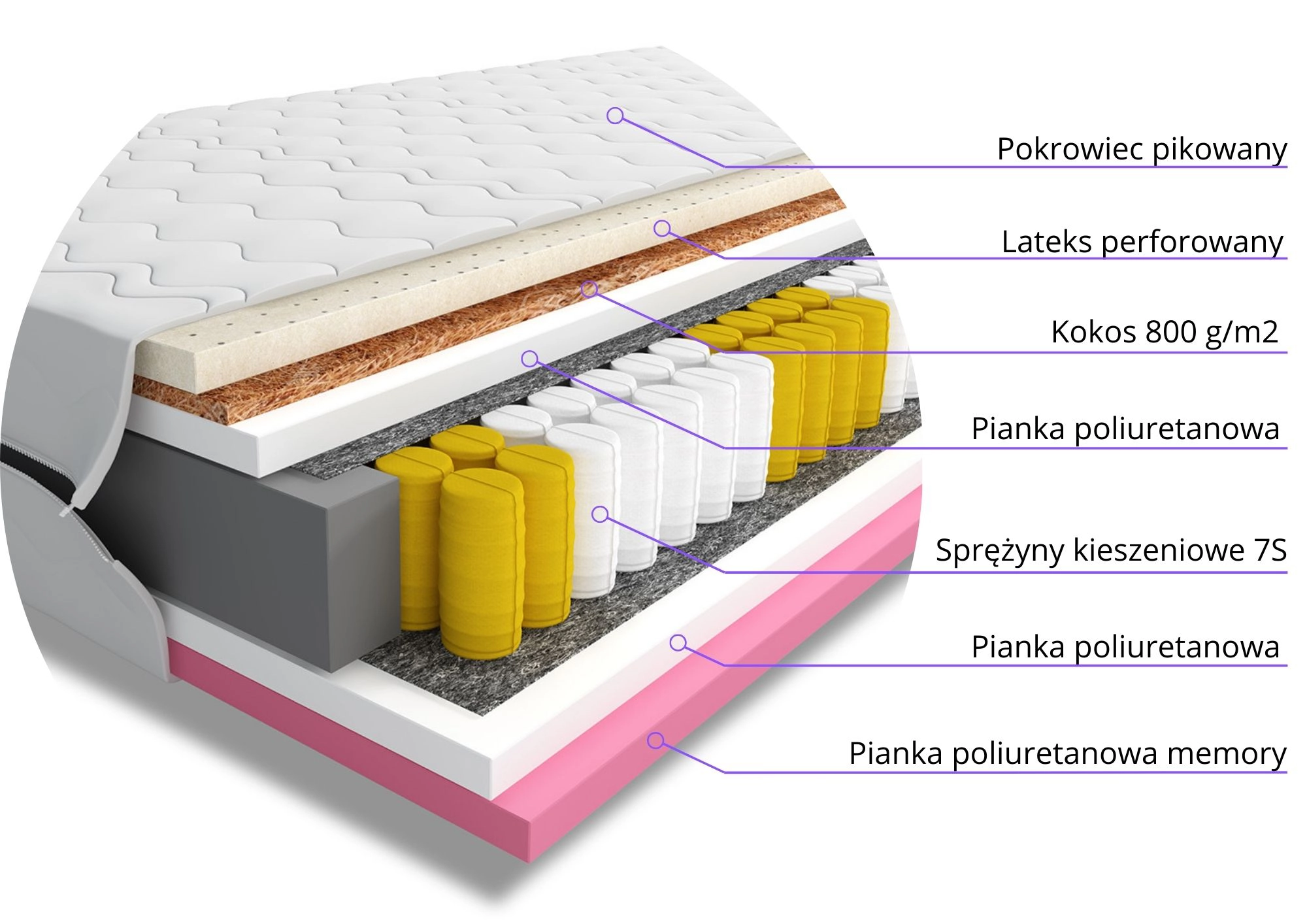 Główna warstwa sprężyn kieszeniowych 7S o wysokości 12 cm oferuje 7 stref twardości, które precyzyjnie podpierają różne części ciała. Każda sprężyna jest podwójnie hartowana, co zapewnia długowieczność i stabilność konstrukcji, minimalizując przenoszenie ruchów partnera i gwarantując spokojny sen.
