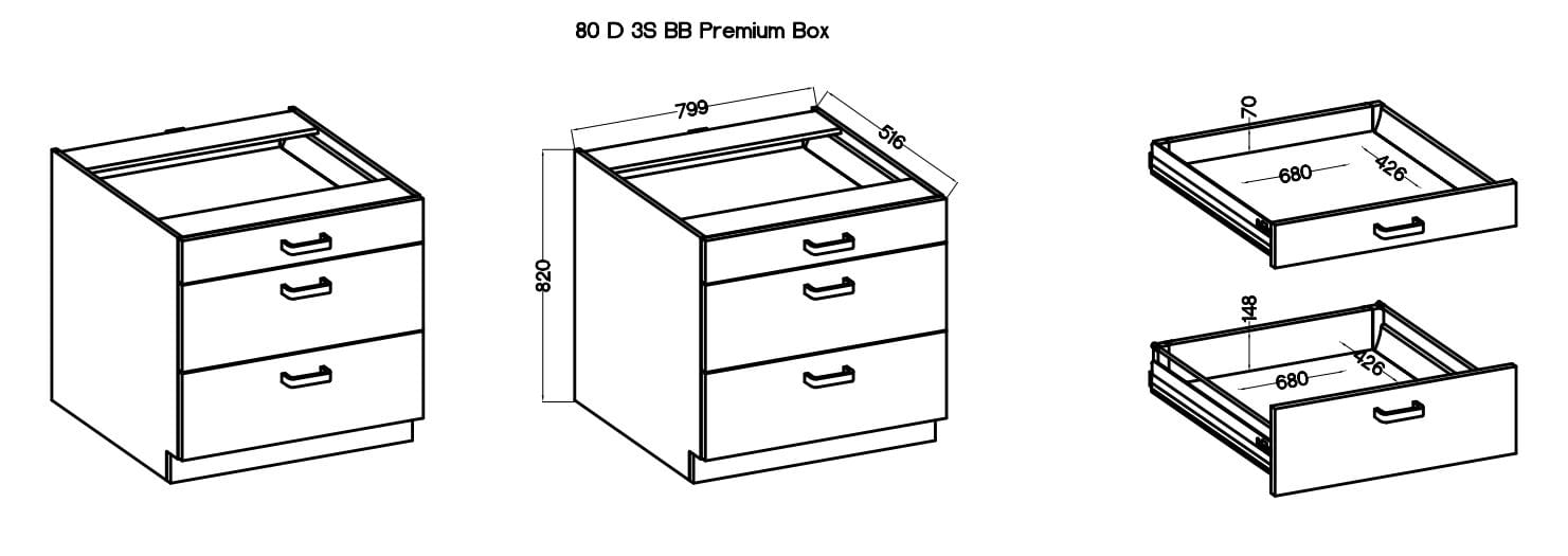 Dane techniczne Szafka kuchenna dolna 3 szufladami LARA 80 D 3S Grafit/Biały