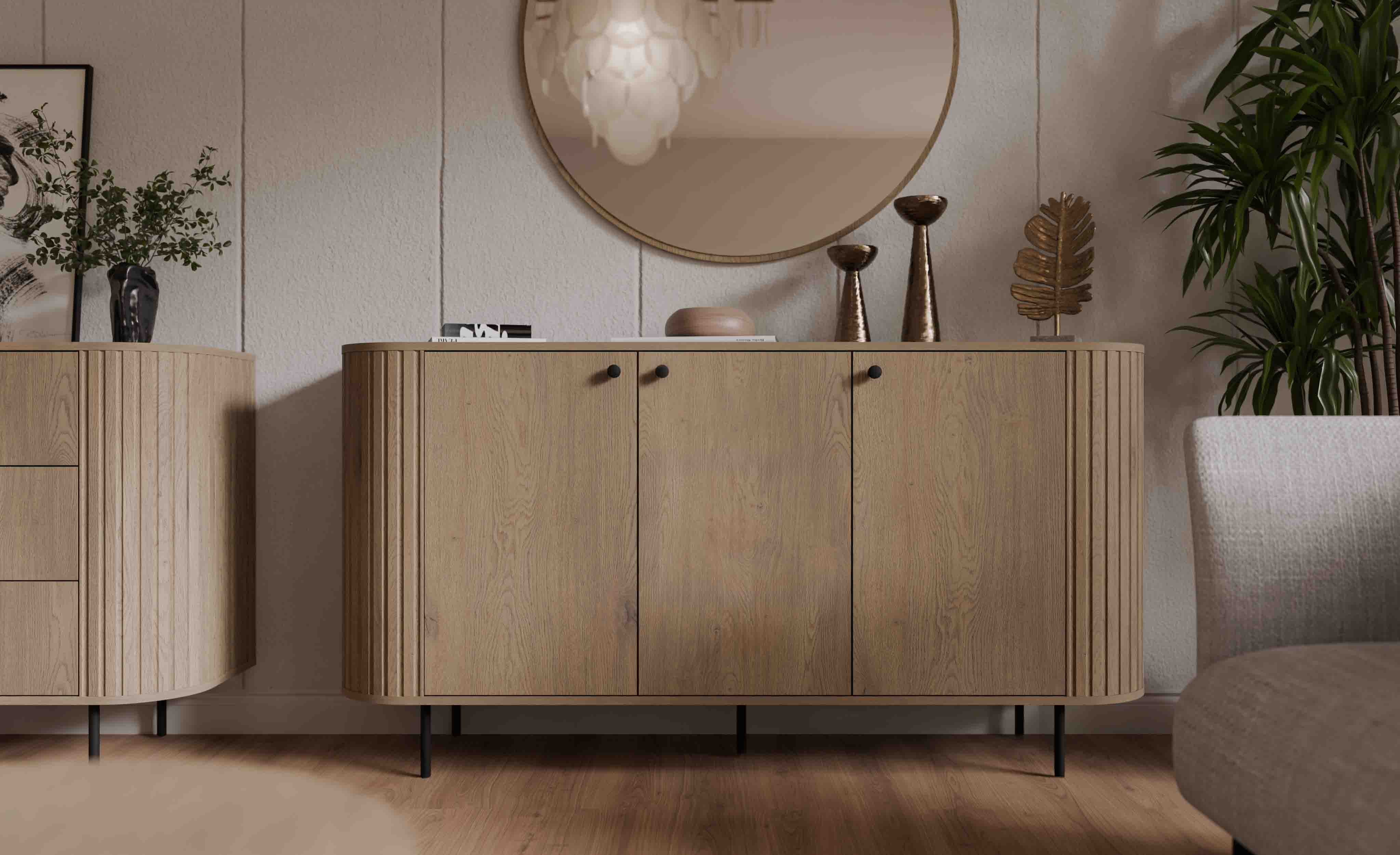 Kolekcja łączy nowoczesną formę z subtelną elegancją. Charakterystyczne, pionowe ryflowania po bokach nadają meblom lekkości i dekoracyjnego wyrazu. Seria dostępna jest w dwóch odsłonach kolorystycznych: beż piaskowy ze złotymi akcentami oraz dąb Cremona z czarnymi dodatkami. Całość dopełniają smukłe metalowe nóżki, które nadają meblom lekkości, podkreślają ich nowoczesny charakter i ułatwiają utrzymanie czystości pod meblem. Dzięki temu kolekcja Flana świetnie wpisuje się zarówno w jasne, minimalistyczne wnętrza, jak i w bardziej wyraziste aranżacje.