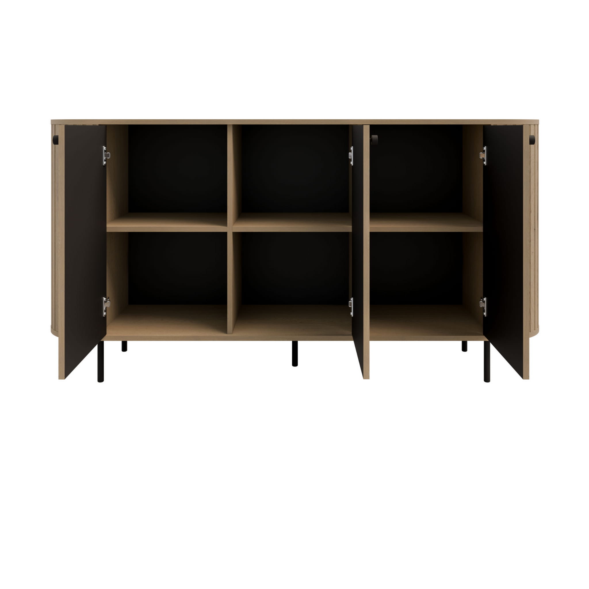 Komoda łączy elegancki wygląd z praktycznymi rozwiązaniami. Troje drzwi skrywa trzy funkcjonalne przestrzenie z półkami, dzięki czemu łatwo utrzymać porządek. Kolor dąb Cremona dobrze komponuje się z czarnymi uchwytami i metalowymi nóżkami, tworząc nowoczesny i spójny wygląd. Czarne wnętrze podkreśla charakter mebla, a cichy domyk sprawia, że korzystanie z komody jest wygodne i bezgłośne.