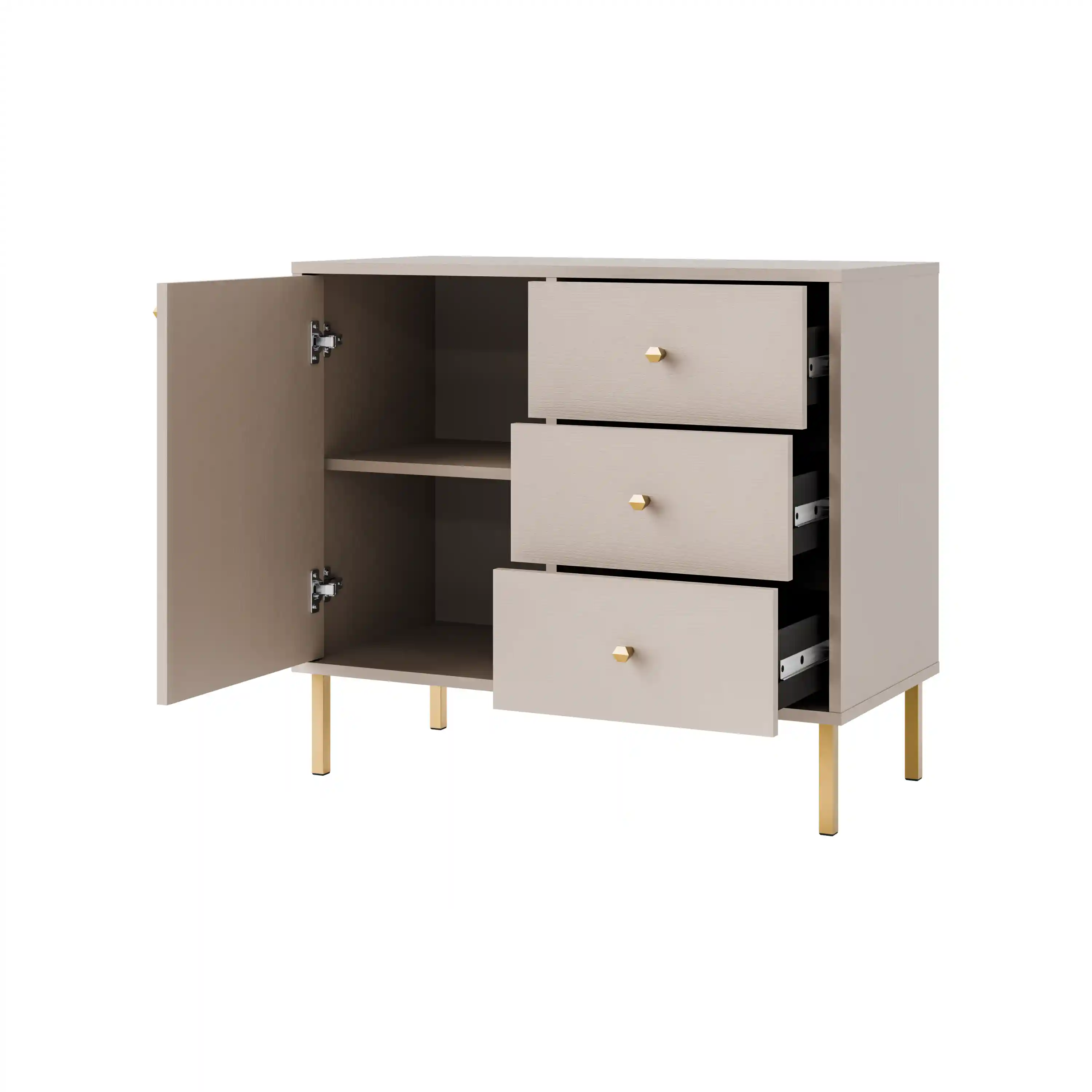 Stylowa komoda na złotych, metalowych nogach łączy nowoczesny wygląd z funkcjonalną budową. Została wyposażona w trzy szuflady, szafkę z frontem uchylnym oraz jedną półkę wewnętrzną, dzięki czemu umożliwia wygodne przechowywanie różnych przedmiotów. Złote uchwyty dodają elegancji, podkreślając charakter całej kolekcji. To praktyczny mebel, który sprawdzi się zarówno w salonie, jak i w przedpokoju czy sypialni.
