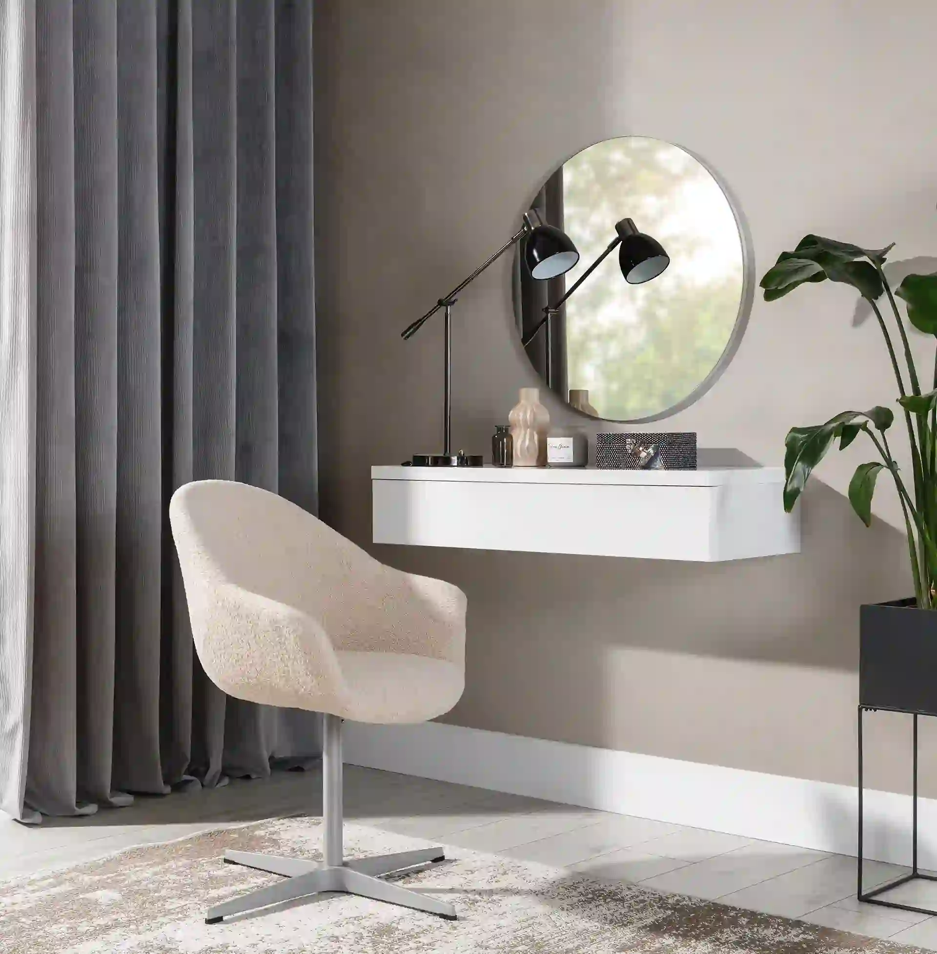 Ciesz się nowoczesnym designem i funkcjonalnością dzięki naszej toaletce. Idealna propozycja dla tych, którzy cenią sobie elegancję i praktyczne rozwiązania w swojej sypialni lub garderobie. Toaletka Navene to nie tylko miejsce do codziennych przygotowań, ale również wyrafinowany element dekoracyjny, który nadaje charakteru przestrzeni. Jej minimalistyczna forma i eleganckie wykończenie sprawiają, że doskonale komponuje się z różnymi stylami aranżacji wnętrz. Dodatkowo, praktyczne schowki i półki pozwalają utrzymać porządek w kosmetykach i akcesoriach, zapewniając jednocześnie łatwy dostęp do nich. Dzięki możliwości zawieszenia na ścianie, toaletka Navene oszczędza cenną przestrzeń podłogową, co jest szczególnie istotne w mniejszych pomieszczeniach. Jest to więc nie tylko funkcjonalne, ale i estetyczne rozwiązanie dla osób poszukujących harmonijnego wyposażenia swojej sypialni czy garderoby.