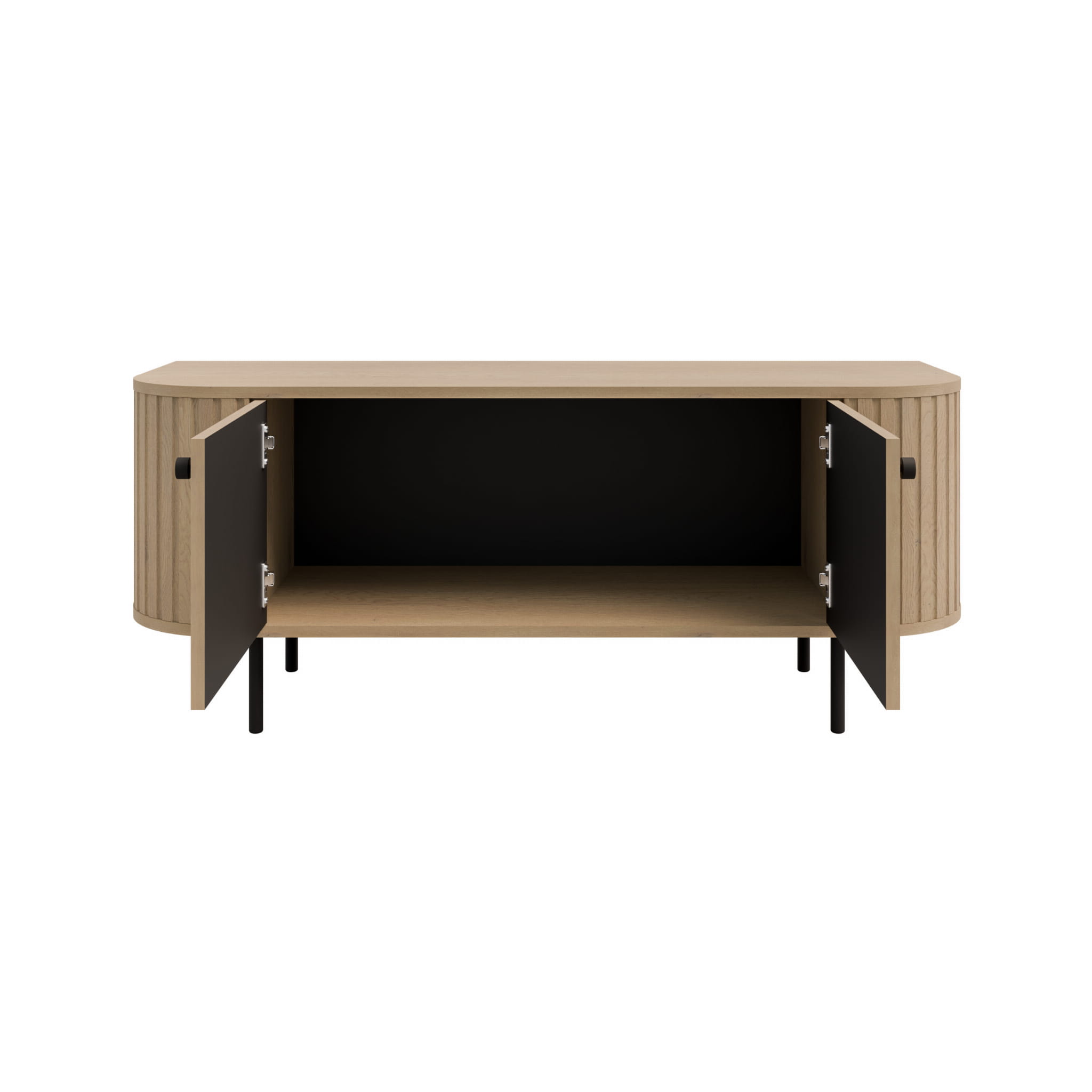 Szafka RTV oferuje wygodną przestrzeń do przechowywania i doskonale sprawdza się zarówno przy telewizorze, jak i jako elegancki mebel pomocniczy. Wyposażona w dwoje drzwi, zapewnia dużo miejsca na urządzenia, dokumenty czy dodatkowe akcesoria. Wariant w dekorze dąb Cremona wyróżnia się ciepłym, naturalnym odcieniem, który świetnie komponuje się z czarnymi uchwytami i smukłymi metalowymi nóżkami. Czarne wnętrze dodaje meblowi charakteru i eleganckiej głębi, a cichy domyk zawiasów gwarantuje codzienny komfort użytkowania.