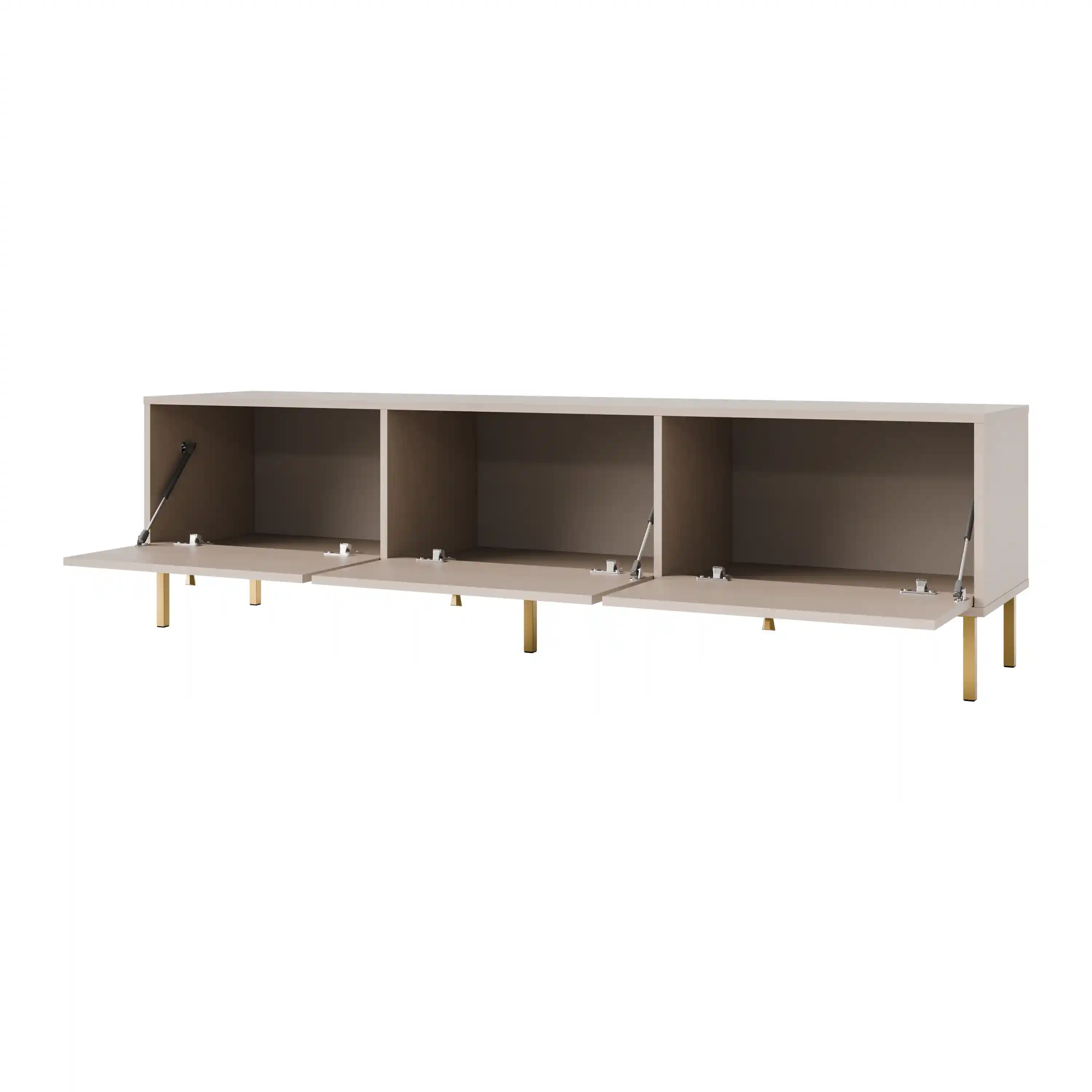 Praktyczna szafka RTV na złotych, metalowych nogach, wyposażona w trzy klapy - doskonała do przechowywania sprzętu RTV i akcesoriów. Dzięki podnośnikom gazowym barkowym, otwieranie klap jest wygodne i bezpieczne. Metalowe gałki w kolorze złotym podkreślają elegancki charakter mebla, a uniwersalny design sprawia, że szafka pasuje do różnych wnętrz.