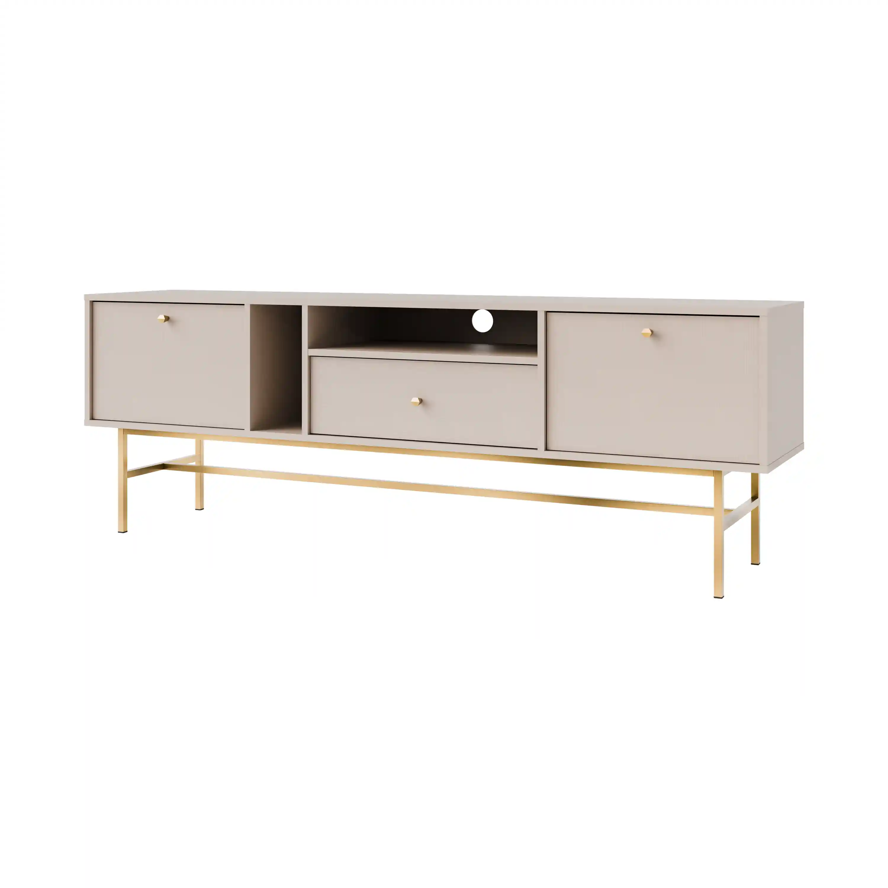 Stylowy i funkcjonalny mebel, który pozwala na schludne przechowywanie sprzętu RTV oraz akcesoriów. Dzięki połączeniu otwartych i zamkniętych przestrzeni ułatwia utrzymanie porządku, a nowoczesny design ze złotymi detalami sprawia, że szafka stanie się ozdobą każdego salonu.