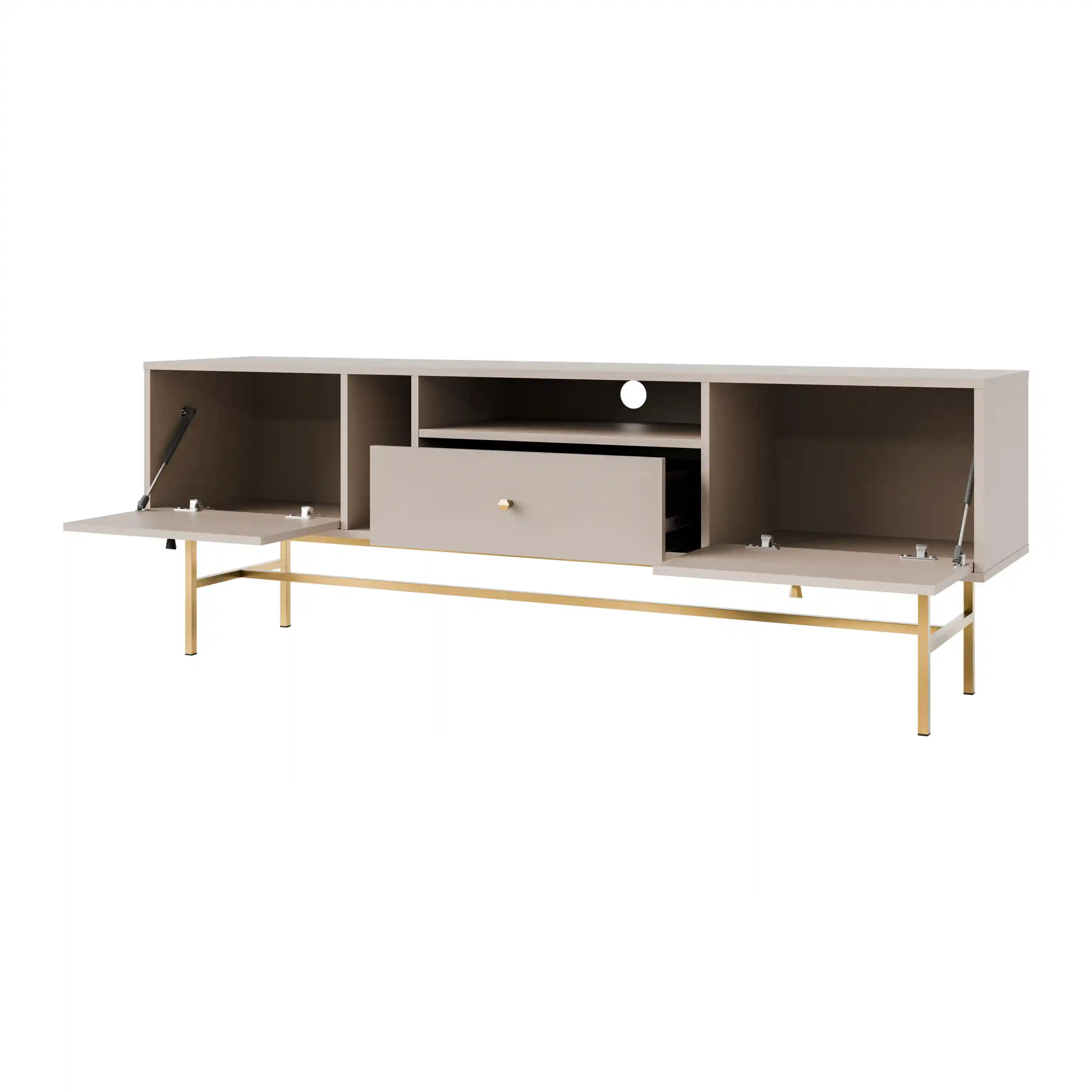 Funkcjonalna szafka RTV wyposażona w dwie zamykane części na drzwiach oraz jedną pojemną szufladę z prowadnicami kulkowymi, które zapewniają płynne i ciche otwieranie. Mebel posiada również podnośniki gazowe klap, ułatwiające wygodne korzystanie i dostęp do wnętrza. Uchwyt w postaci metalowej gałki w kolorze złotym dodaje stylowego akcentu, harmonijnie łącząc się z nowoczesną formą i złotą podstawą.