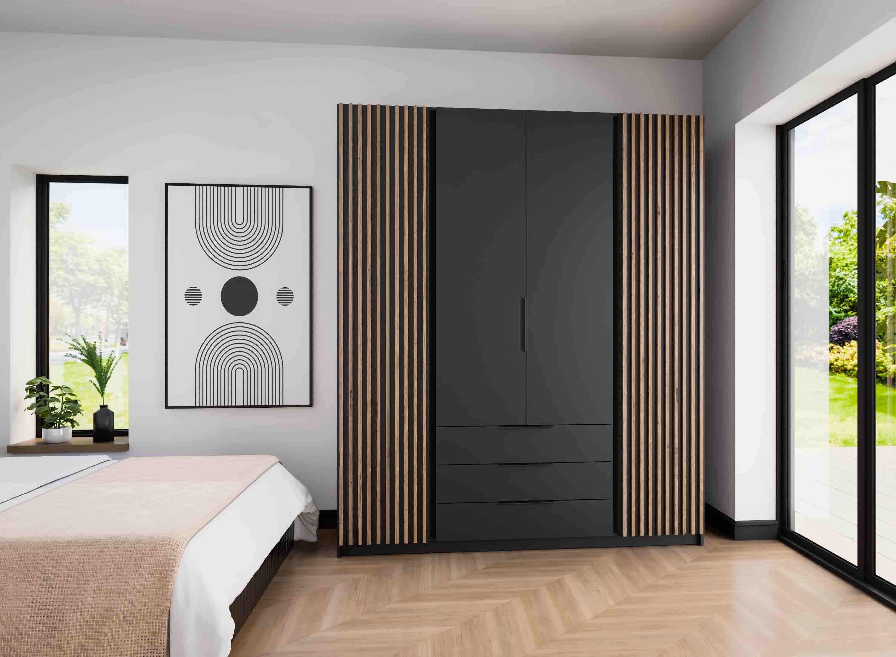 Szafa DRAVERO BL/BL-EV 2 LAM 2F 3S to nowoczesny mebel łączący elegancką czerń z ciepłym odcieniem dębu evoke. Ozdobne lamele na frontach nadają jej wyjątkowego charakteru i sprawiają, że idealnie wpisuje się w najnowsze trendy aranżacyjne. Dzięki przemyślanemu układowi wnętrza, szafa zapewnia doskonałą organizację odzieży oraz dodatków.