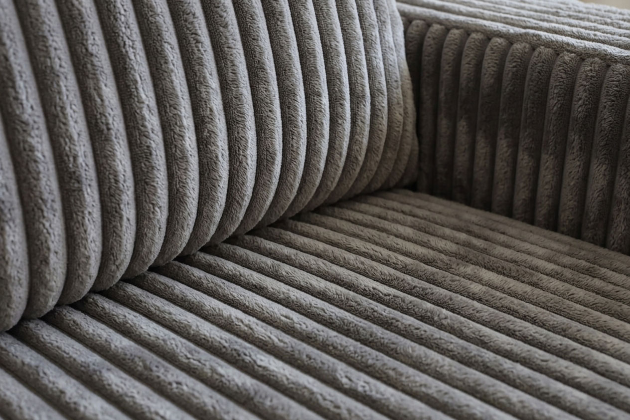 - ✅ Gruba tkanina sztruksowa– mięsista, miękka i przyjemna w dotyku struktura z wyraźnym prążkowaniem oraz wysoką gramaturą, która nadaje narożnikowi solidny i przytulny wygląd.