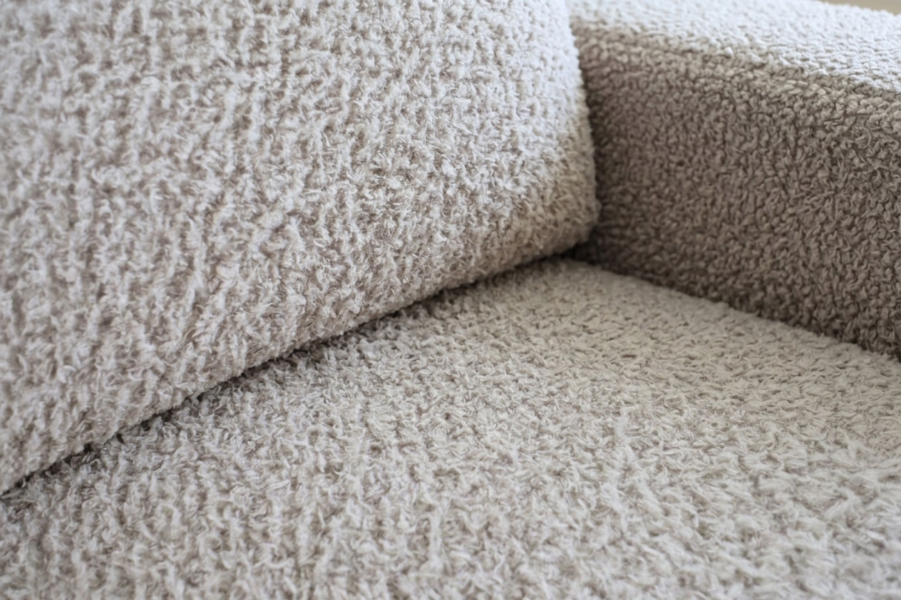 - ✅ Tkanina boucle (baranek) – miękka, puszysta i przyjemna w dotyku struktura o modnym, przytulnym wyglądzie; trwała i łatwa w codziennym użytkowaniu
