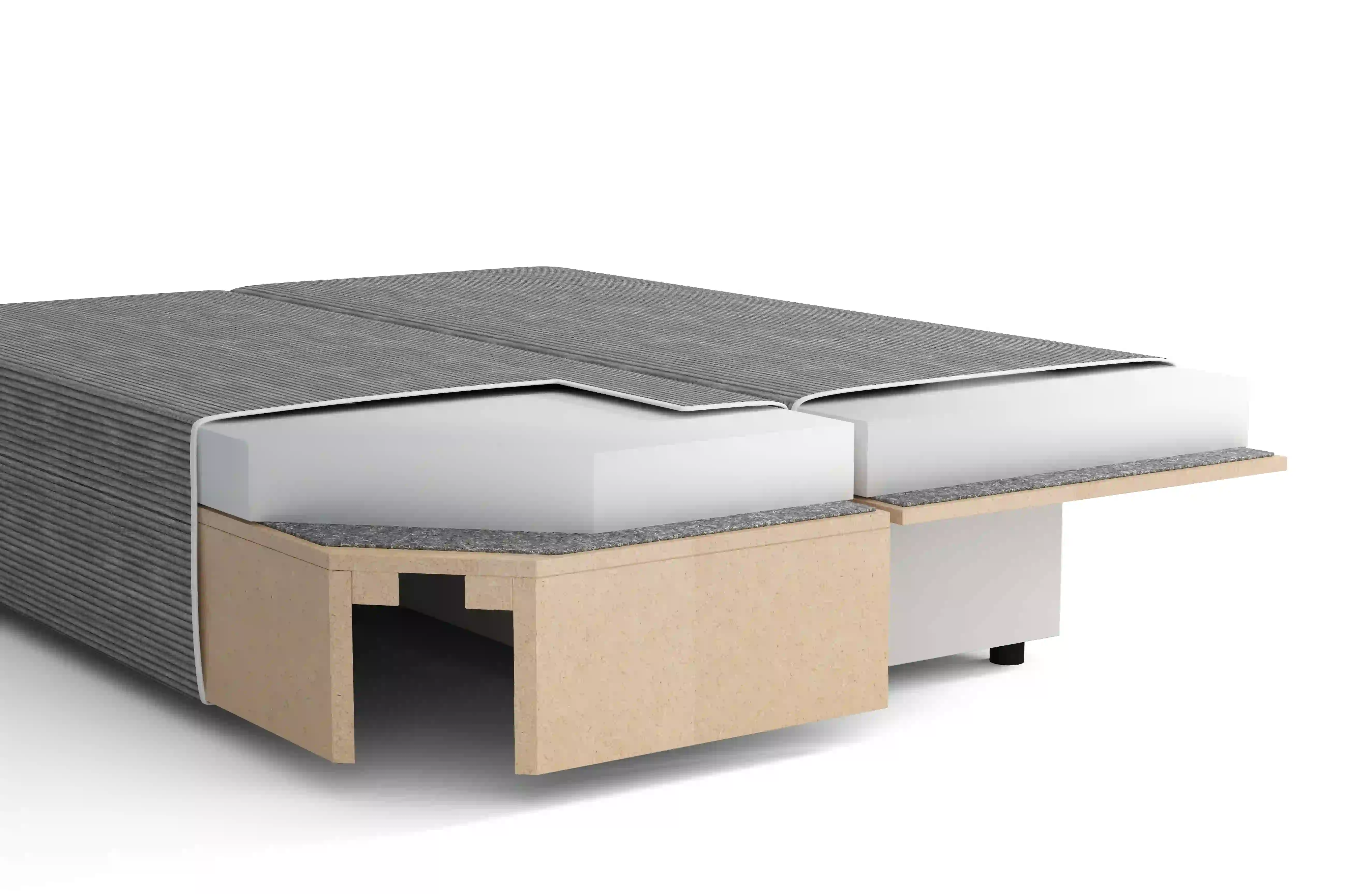 Dzięki niej w łatwy i szybki sposób przekształcisz sofę w dwuosobowe łóżko o szerokości 140 cm i długości 195cm. Cała powierzchnia spania wypełniona jest pianką o równomiernej gęstości i grubości, dzięki temu uzyskana powierzchnia spania cechuje się identyczną twardością i komfortem wypełnienia, na każdej połowie. Śpisz jak na dobrym materacu. Uzyskana po rozłożeniu powierzchnia dzielona jest w proporcji 50:50, czy po 70 cm dla każdej połowy.