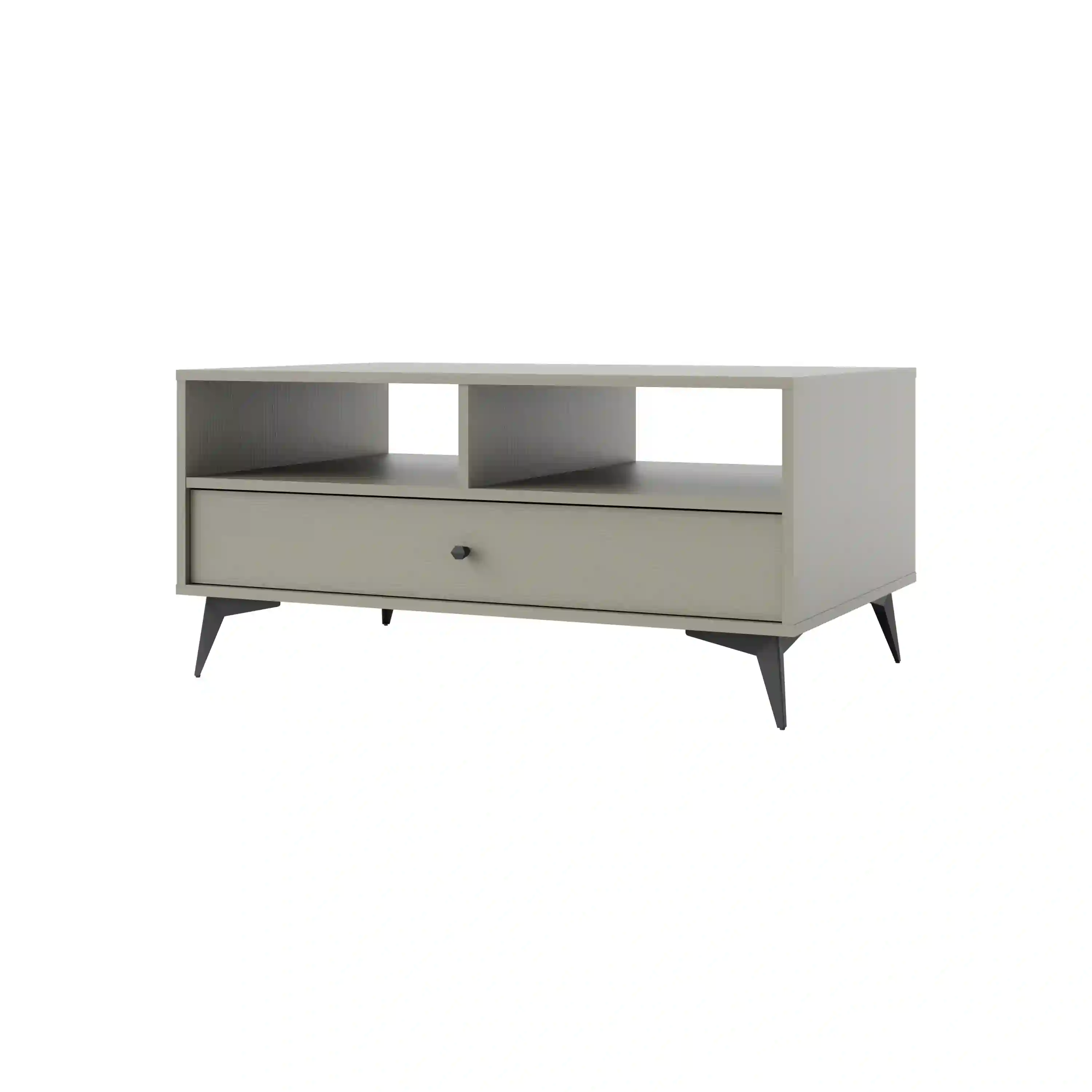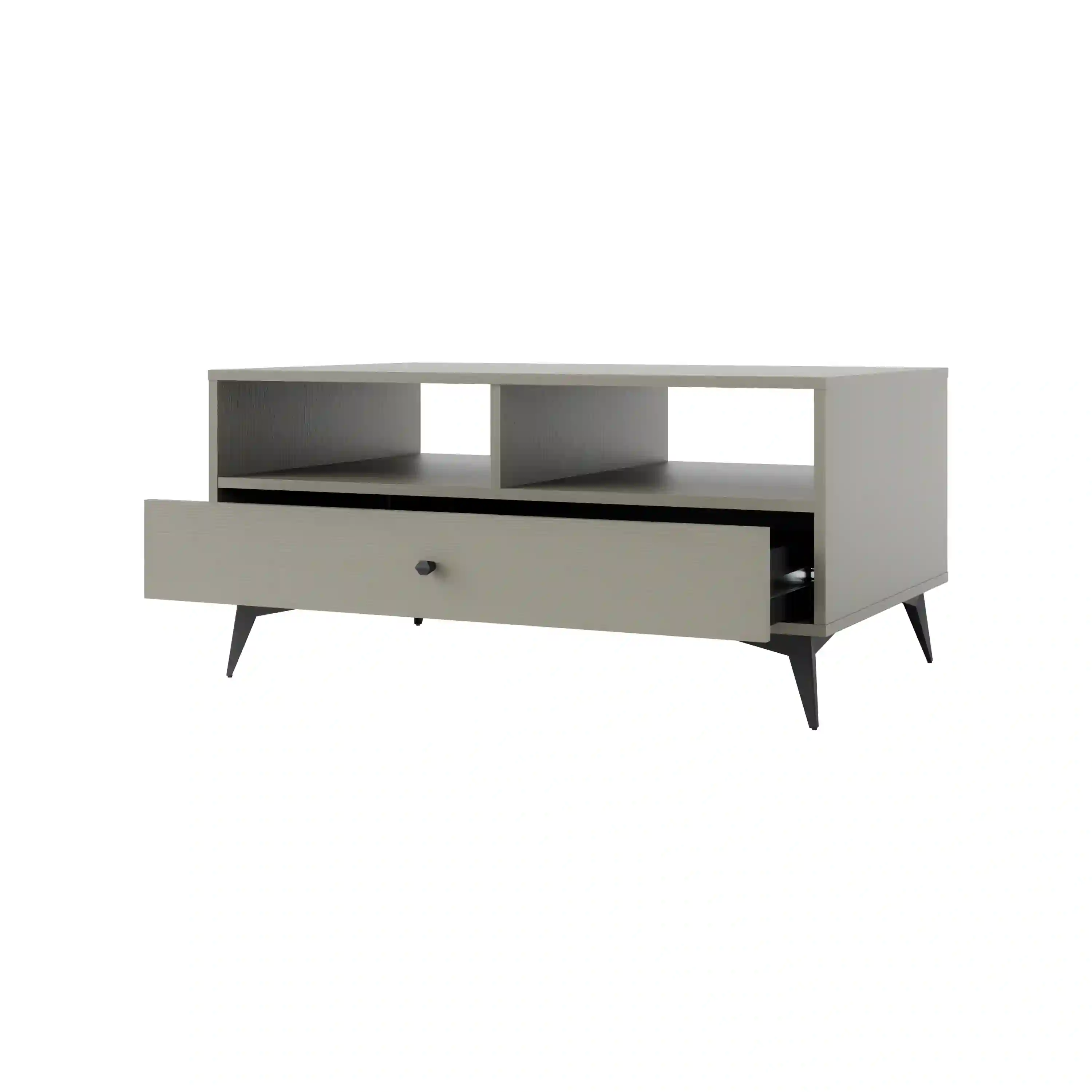 Stylowy stolik kawowy z jedną pojemną szufladą i dwiema wnękami otwartymi to funkcjonalny mebel, który łączy wygodę użytkowania z eleganckim wykończeniem. Czarne uchwyty i wysokie, metalowe nóżki nadają mu lekkości oraz nowoczesnego charakteru, doskonale wpisując się w aranżacje o różnym stylu. Dzięki przemyślanej konstrukcji mebel oferuje miejsce zarówno na podręczne akcesoria, jak i elementy dekoracyjne.