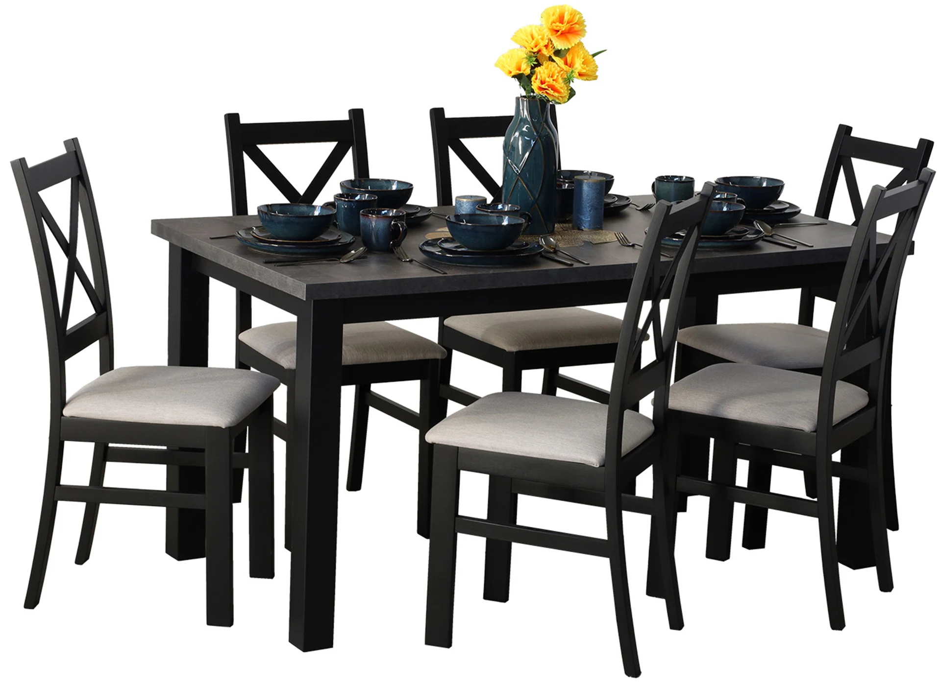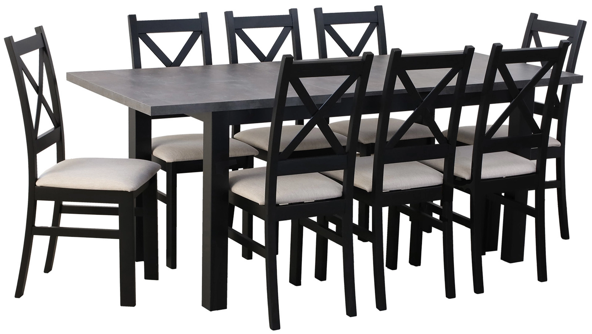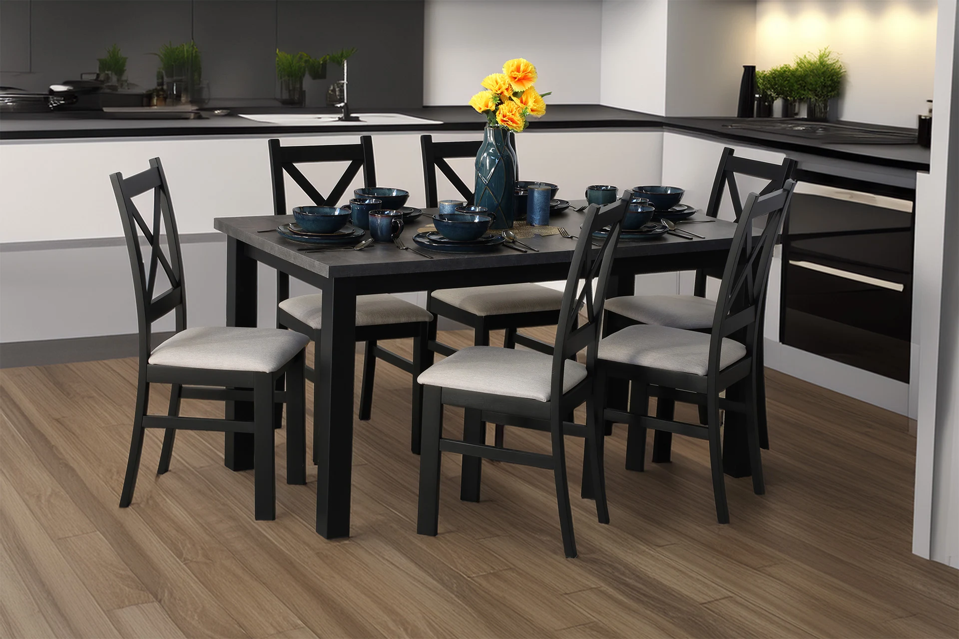 Dodaj odrobinę stylu i funkcjonalności do swojej jadalni lub kuchni z zestawem stołu rozkładanego 150/190x80 z 6 krzesłami M006-6. Ten elegancki zestaw, w nowoczesnym połączeniu czerni i betonu, to idealne rozwiązanie dla każdego domu. Dzięki możliwości rozłożenia stołu, możesz łatwo dostosować jego wielkość do swoich potrzeb - idealny do małych przestrzeni lub na większe spotkania rodzinne.